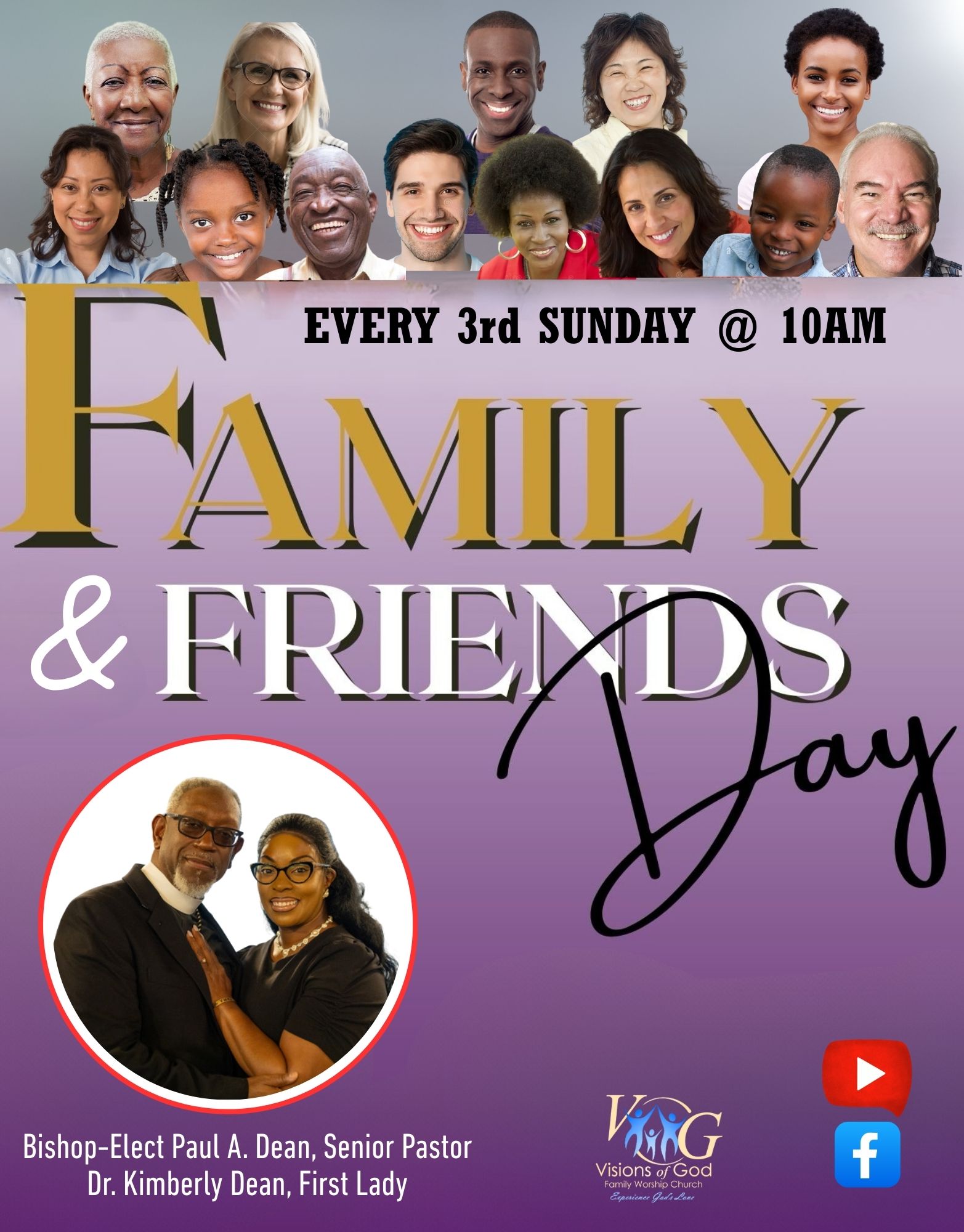 Hello! We’d love to worship with you at Family & Friends Sunday, held every third Sunday at 10:00 AM at Visions of God Family Worship Church, 350 Leland Ave, Plainfield, NJ 07062.